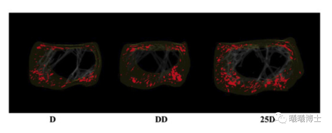 圖片顯示為不同處理對于皮質骨中孔隙空間大小的作用,紅色代表孔隙空洞;D = vitamin D3 at 2,760 IU/kg; DD = vitamin D3 at 5,220 IU/kg; 25D treatment = vitamin D3 at 2,760 IU/kg + 25-OH-D at 2,760 IU (69 μg)/kg.(Source: Chen, et al., 2020)