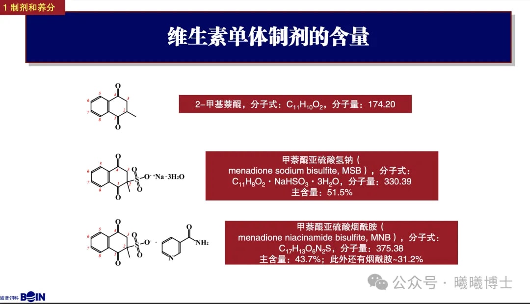 維生素K就是一個典型例子 —— 「2-甲基萘醌」是維生素K的有效成分;在生產(chǎn)中,我們常用的兩種制劑為「甲萘醌亞硫酸鈉」(MSB)和「甲萘醌亞硫酸煙酰胺」(MNB)