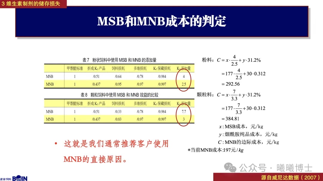 從計算的結果可以看出,對粉料而言,動物要攝入1份甲萘醌,需要4份MSB vs. 2.5份MNB。若是顆粒料,則需要7.7份MSB vs. 3份MNB,添加量差距更大。